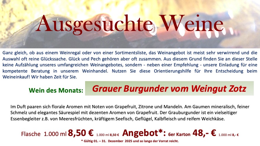 Wir freuen uns, wenn Sie Interesse an unserem Angebot finden. Bitte besuchen Sie uns in unserem Weinhandel. Wir werden Sie bei Ihrem Einkauf persönlich beraten und bedienen.